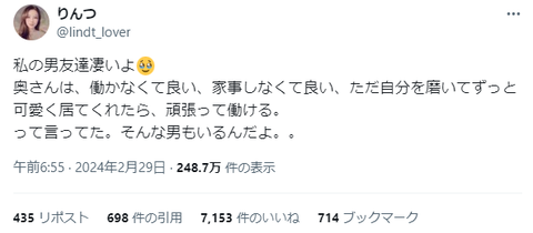 男友達が奥さんに仕事も家事もさせてなくて尊敬。ただ自分磨きして可愛く居てほしいと