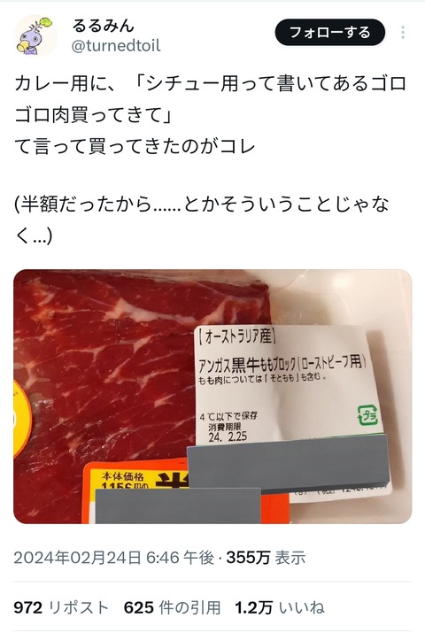 旦那にシチュー用のゴロゴロ肉買ってきてと言ったのにローストビーフ用の肉を買ってきた