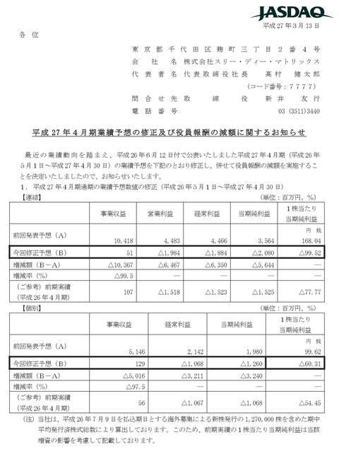 バイオベンチャーのスリー・ディー・マトリックス「売上高を100億円から0.51億円に△99.5%修正いたしました」