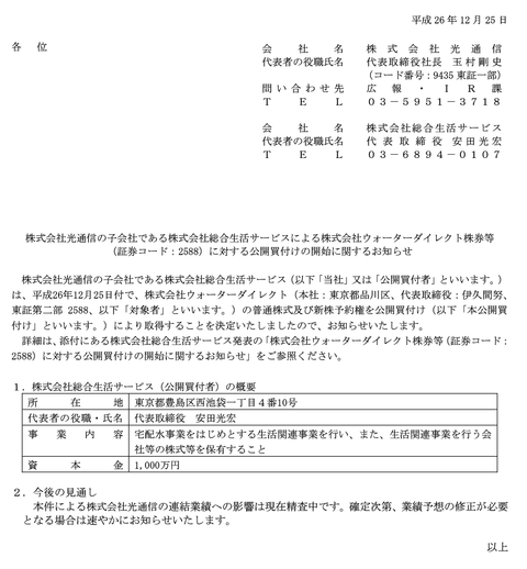 上場直後に1400円の高台に登っていったウォーターダイレクト、1年9ヶ月間ウォータースライダーした後に光通信から650円でTOBされる