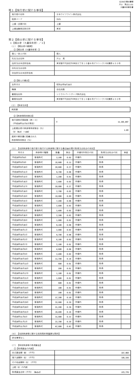 日本ライフラインでも大株主に浮上した個人投資家の片山晃さん、ついに自身の特集記事で日経新聞の1面を飾る