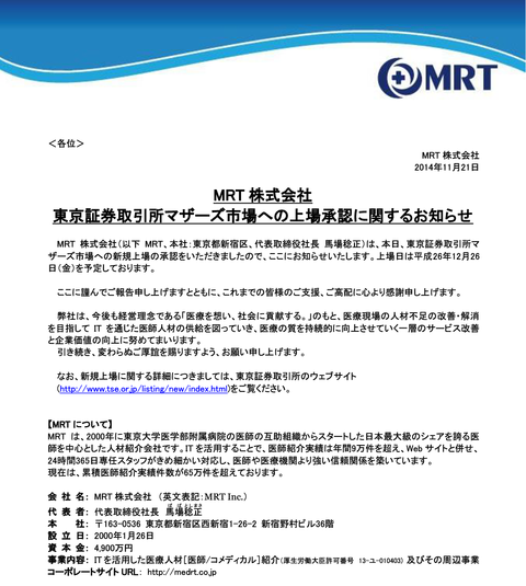 元従業員や元役員との裁判あるけど無問題、医師のための人材紹介屋MRTが民事訴訟3件と刑事事件1件を抱えたまま上場を承認される