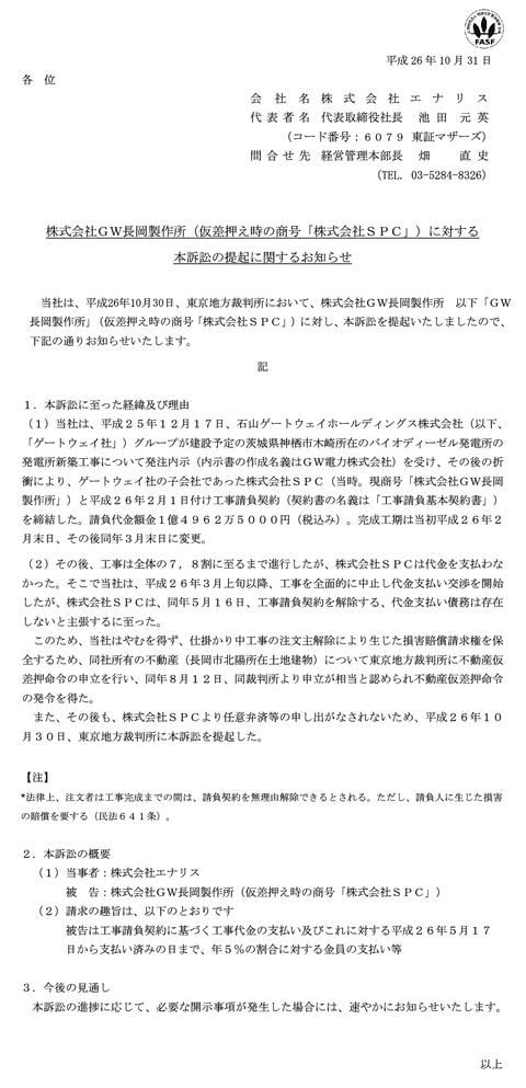 粉飾決算の疑いにより強制調査された石山ゲートウェイHDとそのせいで株価貰い事故したエナリスとの間でアツい訴訟合戦はじまる