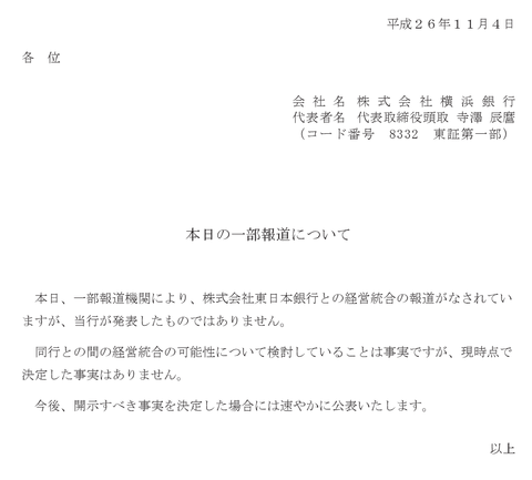 日経新聞の経営統合飛ばし記事に横浜銀行と東日本銀行が仲良く同時に「検討していることは事実」
