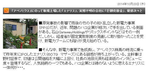 東証マザーズ上場エナリスが一部アウトロー系サイトで「疑惑続々と」と報じられて夜間取引市場で急落