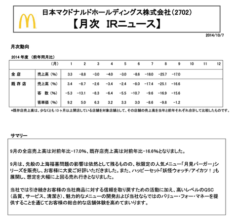妖怪ウォッチ人気にあやかったマクドナルド、既存店の客数が戻るどころか前年比-15.6%まで落ち込む
