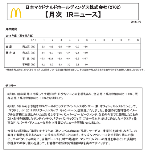 マクドナルドの月次売上「前年同月に比較して土曜日が1日少ない影響もあり-8.6%となりました」