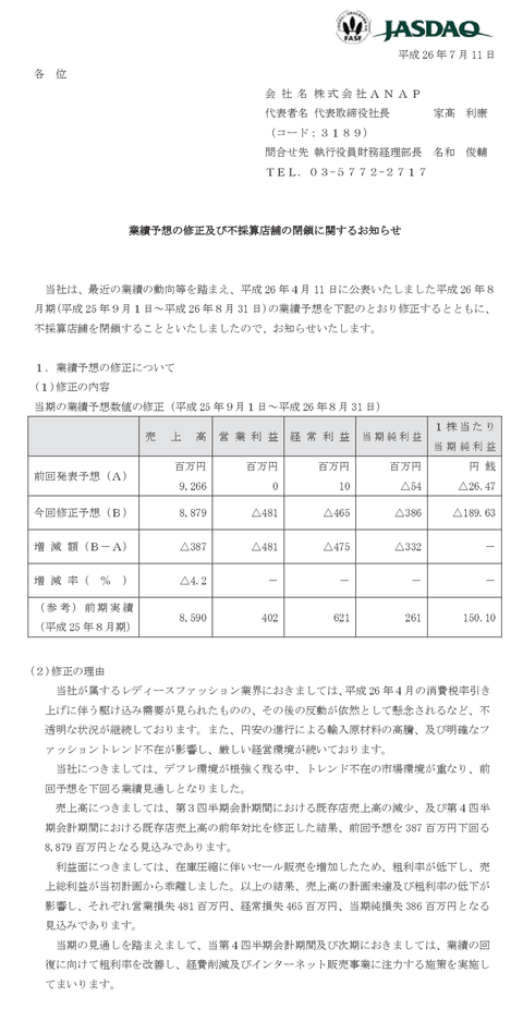 上場ゴールのハットトリックを決めて勢いの止まらないギャル服屋のANAPがさらなる下方修正を冷静に流し込み4点目のゴール