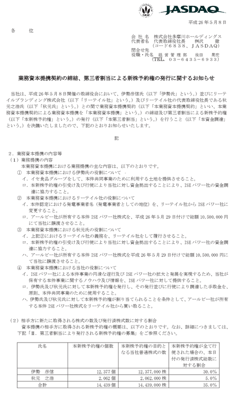 多摩川HD「太陽光発電事業について資本業務提携したはずのイセ食品の伊勢彦信会長からお金が振り込まれませんでした」