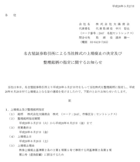 クソ株の玉手箱名古屋セントレックスから太陽商会(旧NowLoading)上場廃止決定のお知らせが届く