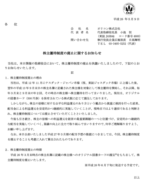 ヒットチャートのオリコン「公平な株主還元という観点から図書カードの優待を廃止して配当金で利益還元します」→「配当金は据え置きます」