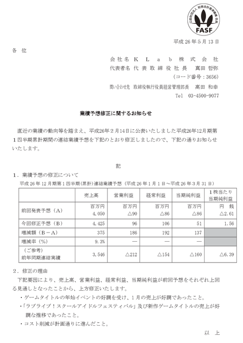 ラブライバー様各位に心からありがとう、第1四半期の黒字化にKLabと株主にっこにっこにー