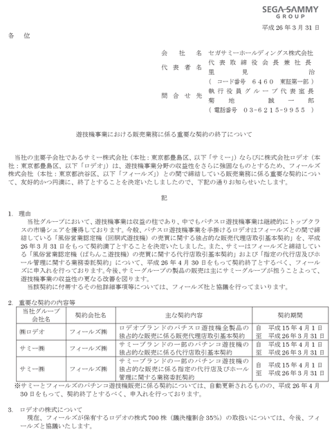 セガサミーHD「フィールズさんとの販売代理店契約は打ち切りということで」 フィールズ「違うよ、全然違うよ」