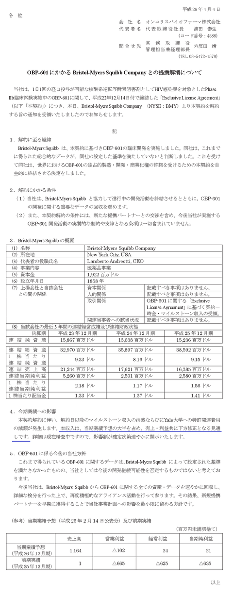 上場4ヶ月足らずのオンコリスバイオファーマ「米医薬品大手ブリストル・マイヤーズから売上の大半を占める抗HIV薬のライセンス契約を解約されました」