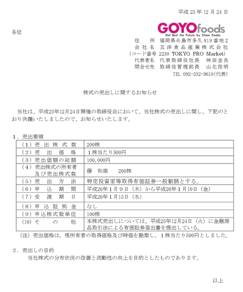 プロが見向きもしないTOKYO PRO Market市場に上場した五洋食品産業が流動性の向上を目的として総額10万円の株式売出しを発表