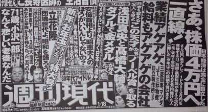 週刊現代「さあ、株価4万円へ一直線!」→大発会の日経平均-382.43円(過去3番目の下げ幅)