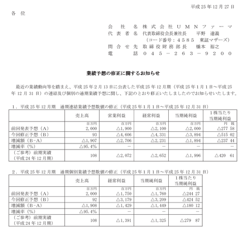 創薬ベンチャーのUMNファーマ「売上高を△95.4%に修正いたしました」