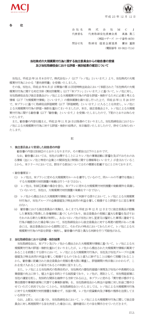 村上ファンド系の投資会社レノが買い集めていたパソコン屋MCJの株を高値で半分くらい売り抜け