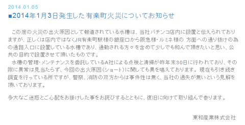 東和産業「出火原因として報道されている水槽はパチンコ店内ではなく通路入口に設置している水槽であり公共の目的で設置させて頂いたものです」