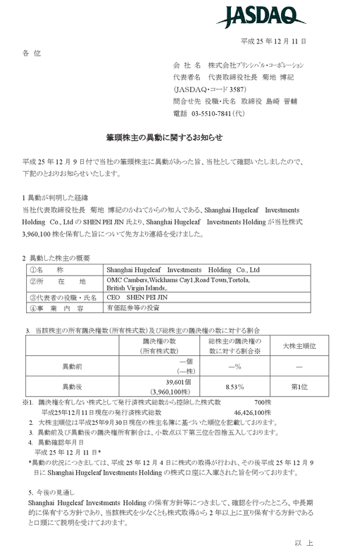 霜見誠さんからクロニクルを紹介されたSHEN PEI JIN(沈培今)さんが菊地博紀社長のかねてからの知人としてプリンシバルの筆頭株主に 市況かぶ全力2階建 |
