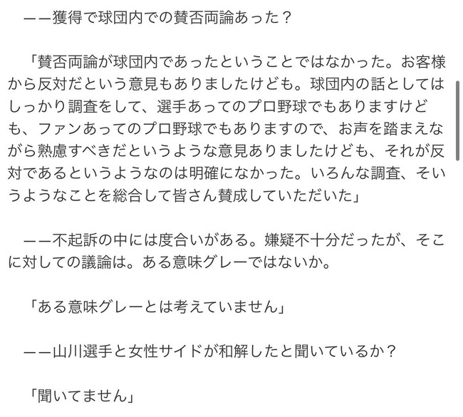 【悲報】ソフトバンク三笠GM「山川が女性と和解したと聞いてないが球団で獲得反対意見は無かった」